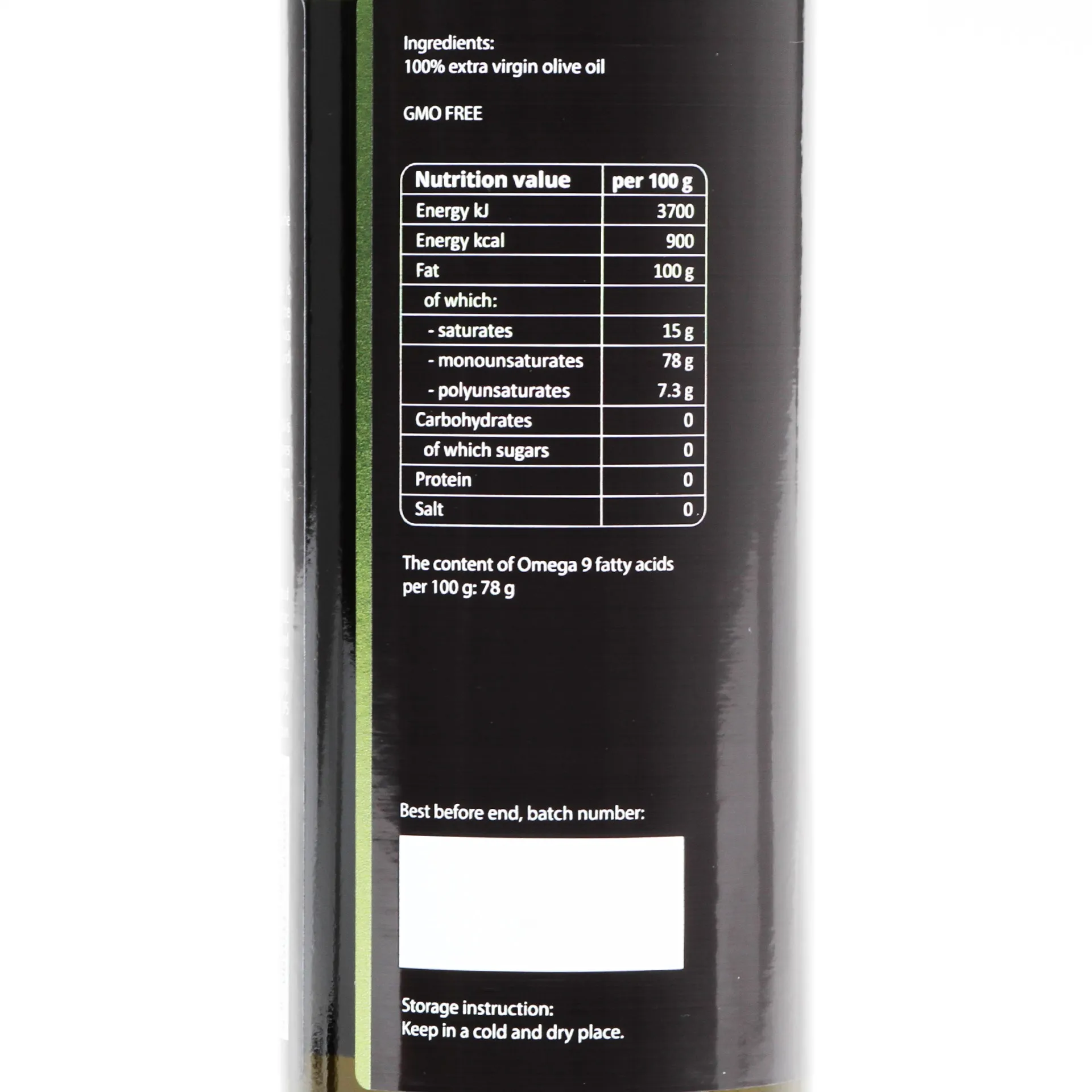 Oliwa z oliwek jest źródłem kwasu Omega 9 (kwasu oleinowego) należącego do grupy jednonienasyconych kwasów tłuszczowych. Kwasy omega 9 wykazują pozytywny wpływ dla prwidłowego funkcjonowania organizmu oraz dla dobrego samopoczucia. Wysoką  zawartość kwasu omega 9 możemy znaleźć właśnie w naszej Oliwie z Oliwek: 78g/100g